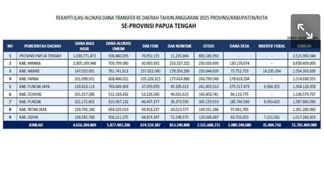 Lampiran: Tabel Anggaran APBD Provinsi dan 8 Kabupaten Se-Provinsi Papua Tengah (2025)