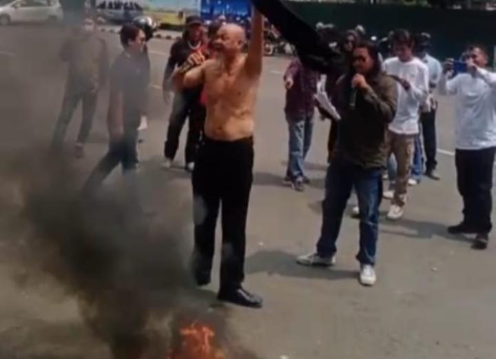 Selain berorasi, pengunjuk rasa membentangkan bendera One Piece di gerbang gedung.